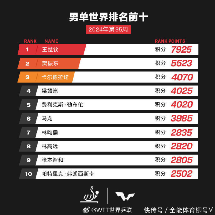 须眉单打寰宇名次前十具体为:王楚钦、樊振东、卡尔德拉诺-雨果、梁靖崑、菲利克斯-勒布伦、马龙、林昀儒、林高远、张本智和、弗朗西斯卡。